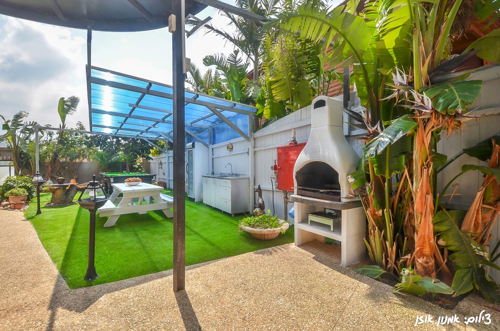 החצר הירוקה והמטופחת כוללת פינת מנגל ומתחם גריל מאובזר לארוחות ערב באוויר ההרים הצלול.