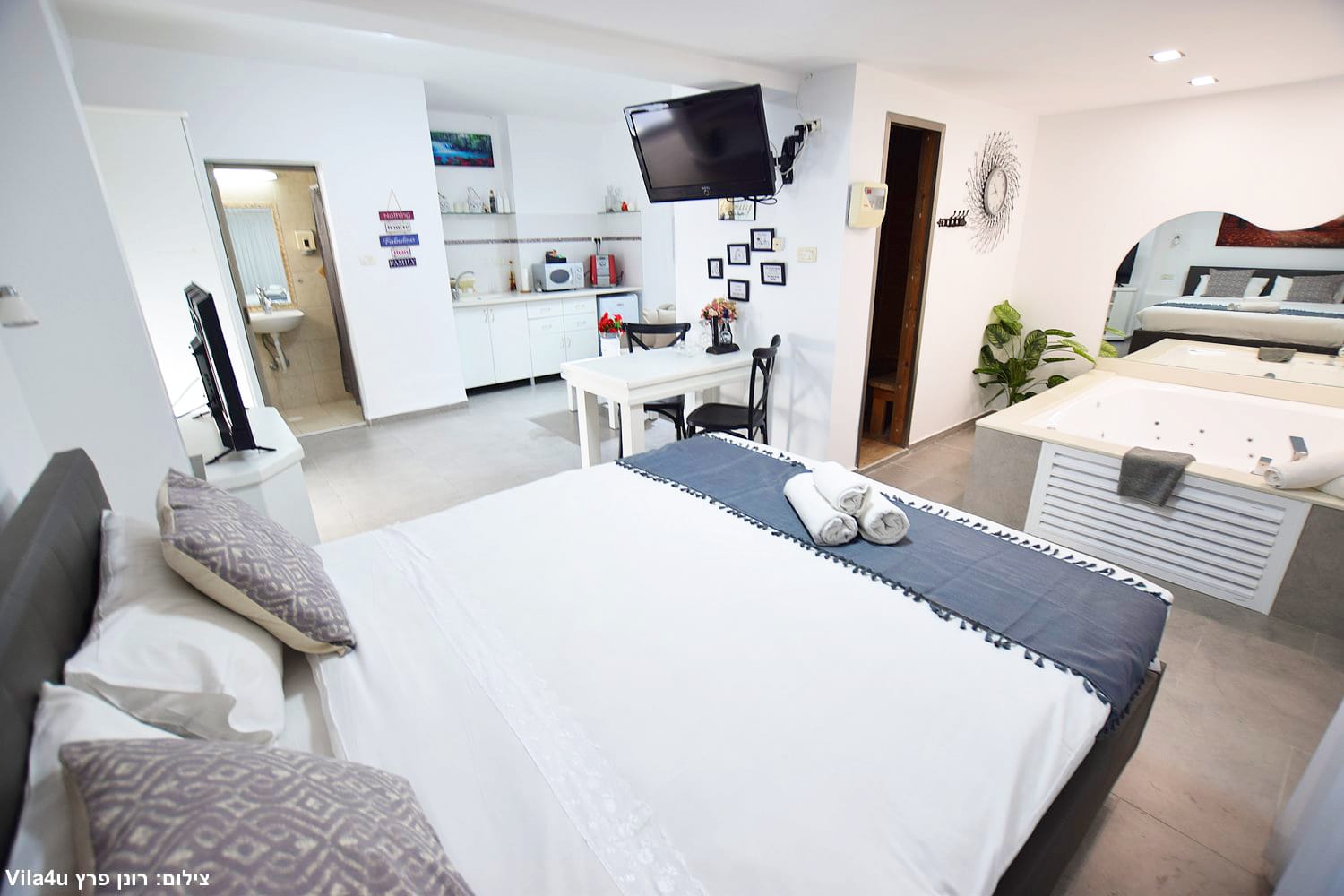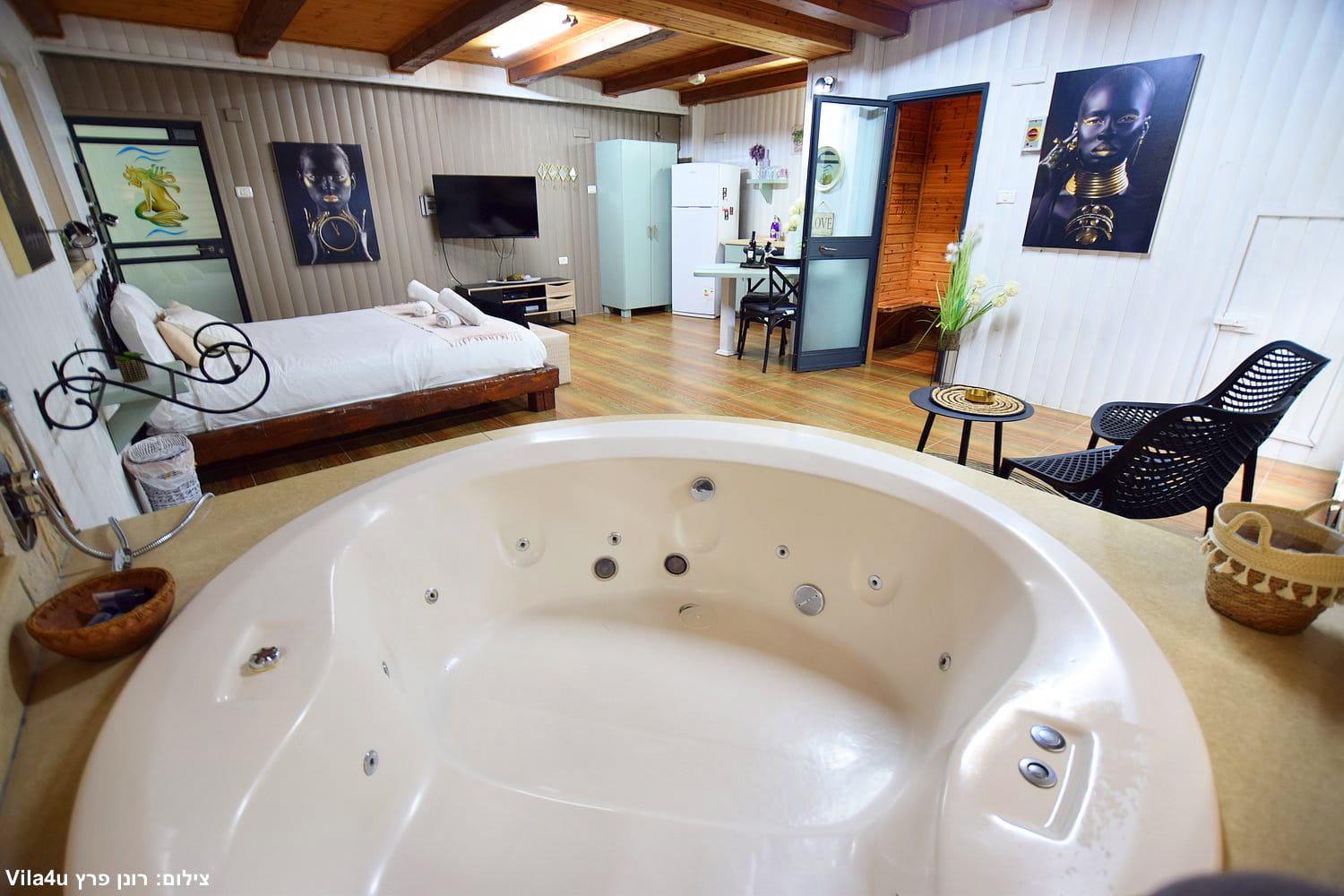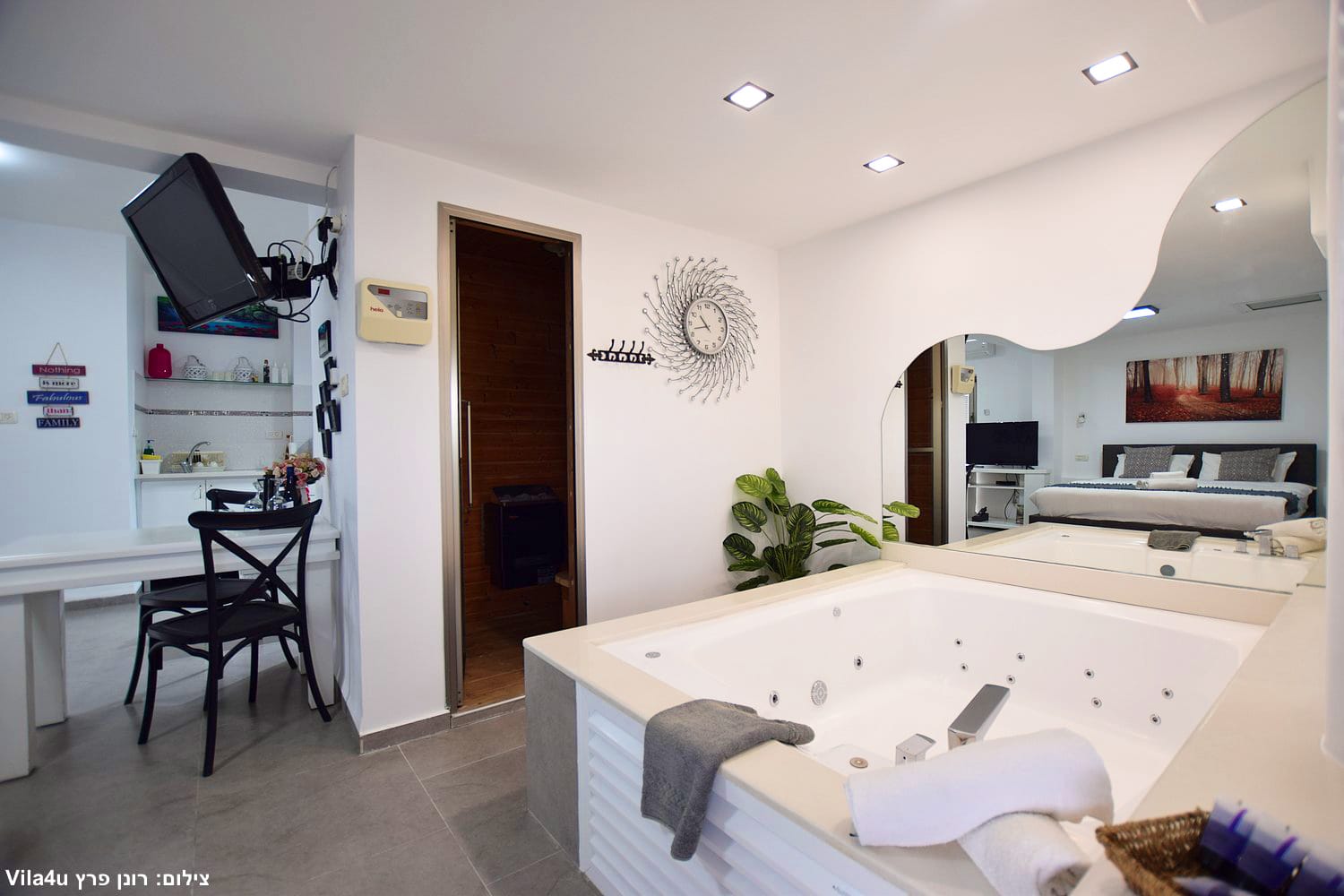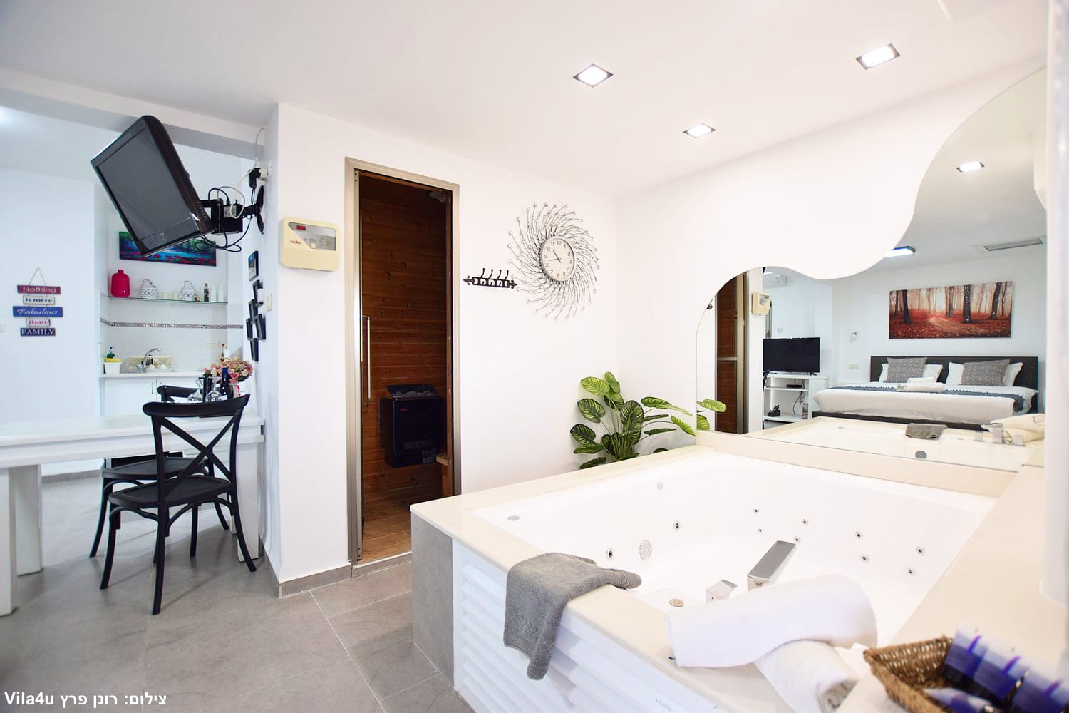 בכל סוויטה תיהנו מג’קוזי זרמים זוגי מפנק וסאונה יבשה פרטית בתוך החדר.